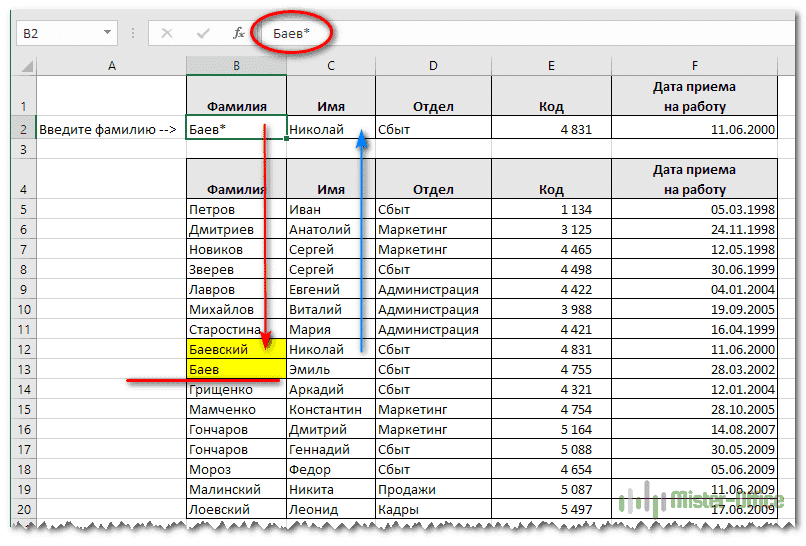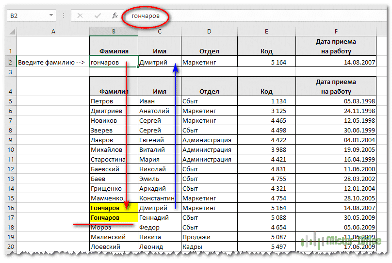 Как и в предыдущих примерах, при вводе фамилии выполняется точный поиск. Но есть некоторые вещи, о которых мы раньше не упоминали.