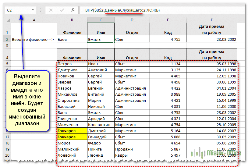 Чтобы упростить использование формул, вы можете создать именованный диапазон, а затем ссылаться на него. В нашем случае назовем его «EmployeeData» (помните, что здесь нельзя использовать пробелы).