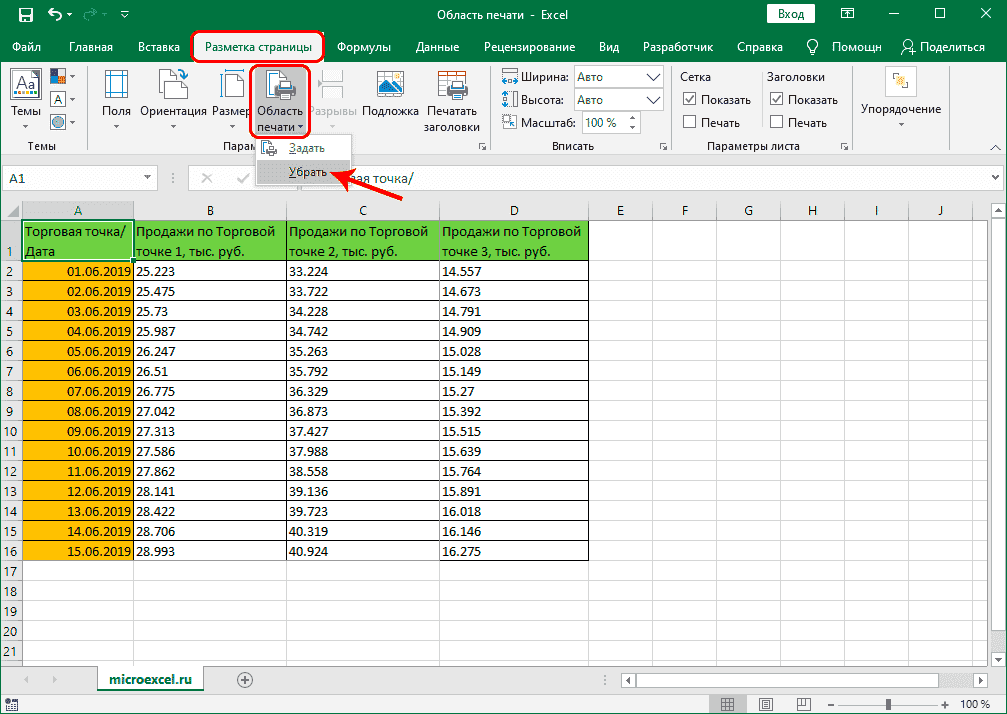 Допустим, нам нужно изменить фиксированную область печати или вообще удалить ее. Для этого вернитесь на вкладку «Макет страницы» в параметрах, которые открываются после нажатия кнопки «Область печати», на этот раз выберите «Удалить». В этом случае нет необходимости заранее выбирать какие-либо диапазоны ячеек в таблице.