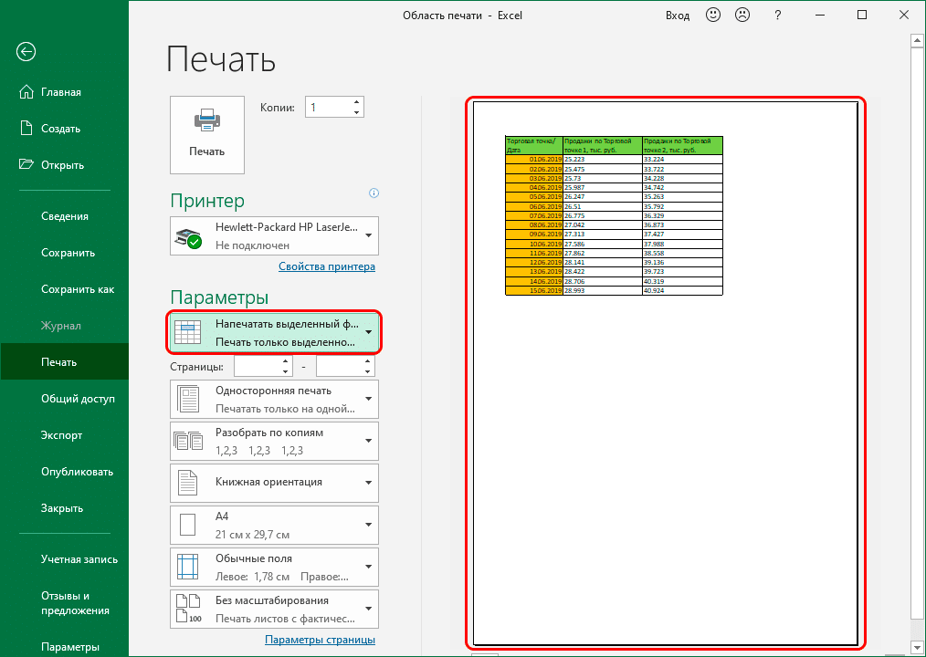 - В результате в области предварительного просмотра документа будет отображаться только выбранная часть таблицы, а это значит, что при нажатии кнопки «Печать» на листе бумаги будет распечатана только эта информация.