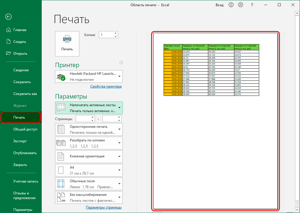 - Таким образом, мы смогли скорректировать область ячейки, которая будет постоянно печататься, пока мы не решим внести какие-либо изменения. Вы можете проверить это в области предварительного просмотра в настройках печати (меню «Файл» — раздел «Печать”).
