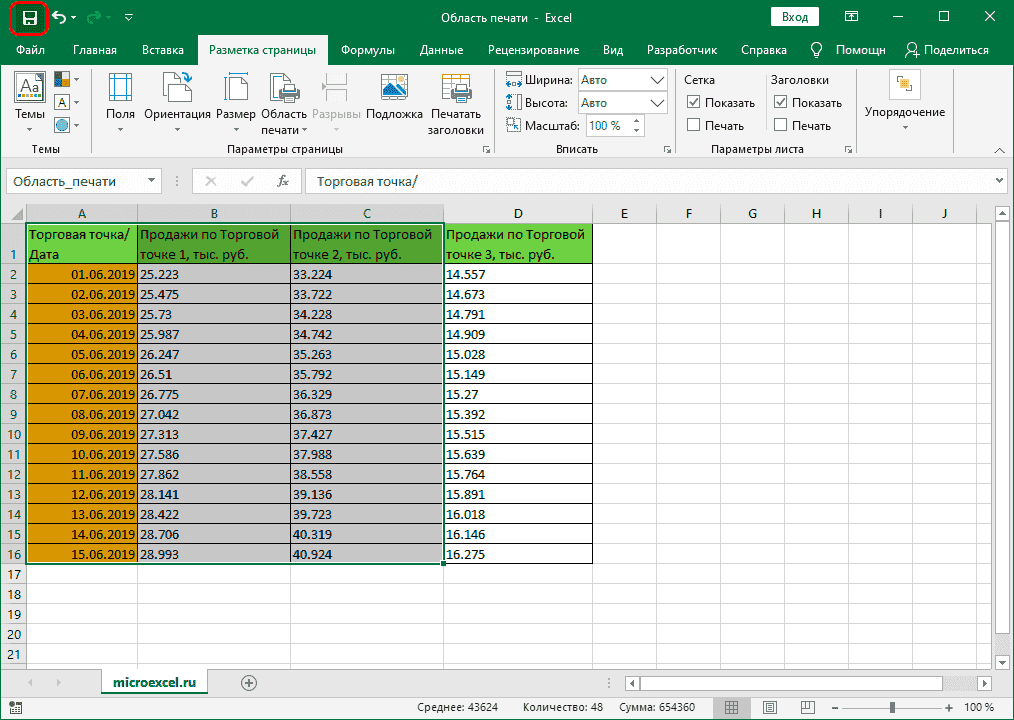 - Любым удобным способом (например, зажав левую кнопку мыши) выделите диапазон ячеек, который мы собираемся отправить на печать. Допустим, нам просто нужно распечатать продажи для первого и второго магазинов. После выбора щелкните меню «Файл”.