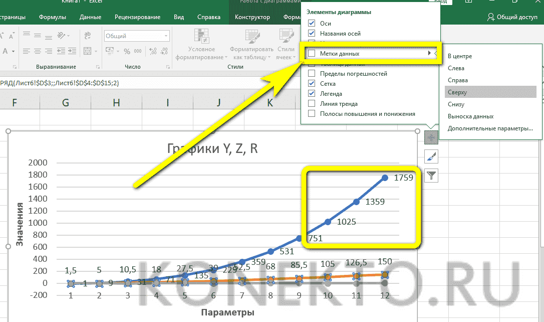 В нашем случае на диаграмме две линии. Первый красный. Второй — синий. Последний нам не нужен, поэтому мы можем удалить его, выделив его и нажав кнопку «Удалить». Так как у нас всего одна линия, также возможно удалить легенду (блок с названиями отдельных линий графика). Но у бомбардиров имя получше. Найдите панель «Инструменты диаграммы» и блок «Метки данных» на вкладке «Макет». Здесь нужно определить положение чисел.