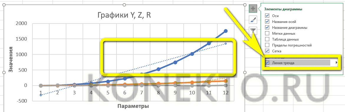 - Линия тренда поможет понять общее направление движения графика; вы можете добавить его для каждой строки значений в том же окне.
