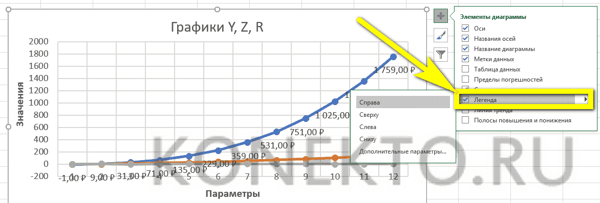 - «Легенда» — не самый полезный, но привычный блок диаграмм Excel. Вы можете удалить или переместить его, сняв флажок в окне «Дополнительные параметры» или вызвав подменю. Более простой вариант — выбрать блок, щелкнув мышью и нажав клавишу Delete или перетащив его в поле диаграммы.