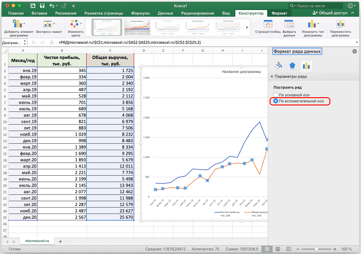 Выберите ось, для которой мы хотим добавить вспомогательную. Правая кнопка мыши — «Форматировать ряд данных» — «Параметры линии» — «По вспомогательной оси».