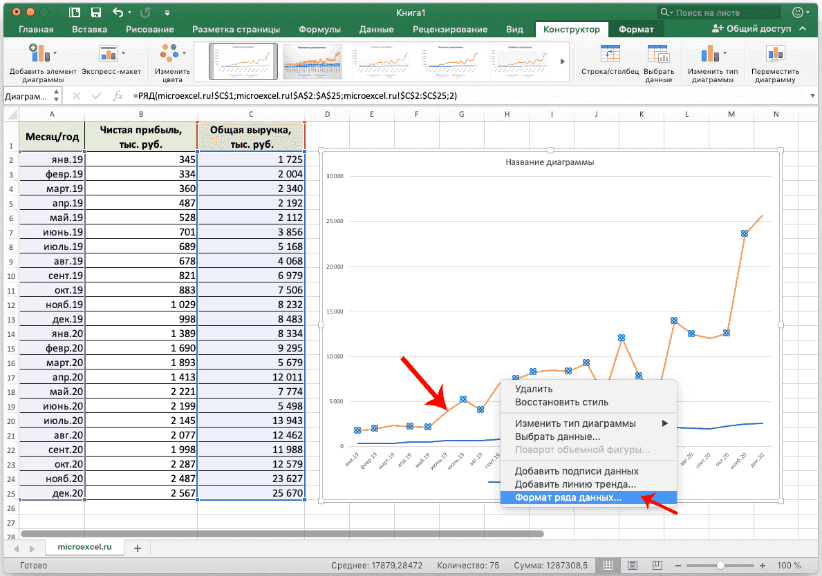 - Полученная диаграмма содержит несколько графиков в зависимости от количества столбцов в выбранной таблице. Теперь вам нужно щелкнуть правой кнопкой мыши по той, для которой вам нужна дополнительная ось. Внизу отображаемого списка выберите «Формат ряда данных…».
