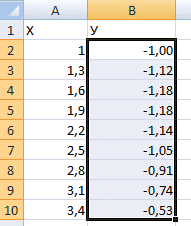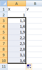 Итак, нам нужно сформировать таблицу из двух столбцов. Первая — это горизонтальная ось (т.е. X), вторая — вертикальная (Y) ось. Вторая строка содержит первое значение, в нашем случае это единица. В третьей строке нужно написать значение, которое будет на 0,3 больше предыдущего. Сделать это можно как с помощью самостоятельных вычислений, так и напрямую написав формулу, которая в нашем случае будет такой: