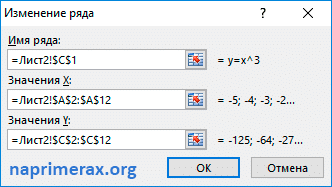 В открывшемся окне в поле «Название серии» выберите ячейку с заголовком столбца, в поле «Значения X» — выберите первый столбец таблицы, «Значения Y» — третий. Щелкните кнопку «ОК».