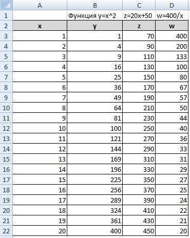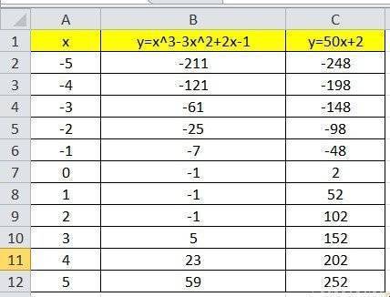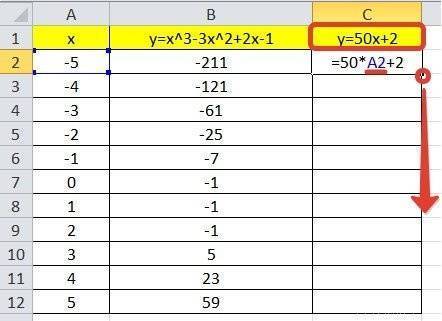 Мы уже построили таблицу для первой функции, добавим третий столбец: значения функции y = 50x + 2 на том же интервале [-5; 5]. Заполним значения этой функции. Для этого в ячейку C2 введите формулу, соответствующую функции, только вместо x мы берем значение -5, например ячейку A2. Скопируйте формулу ниже.
