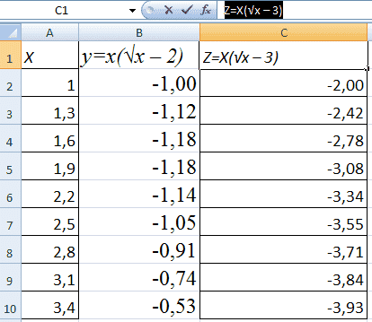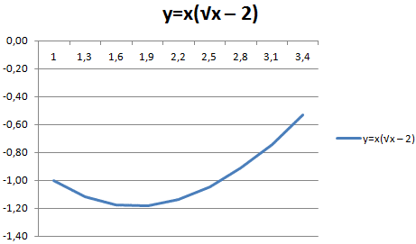 - Создайте таблицу, которая будет служить источником информации. Во-первых, вы должны решить, какая функция будет использоваться именно в вашем случае. Например, y = x (√x — 2). При этом мы выберем 0,3 в качестве шага для использования.
