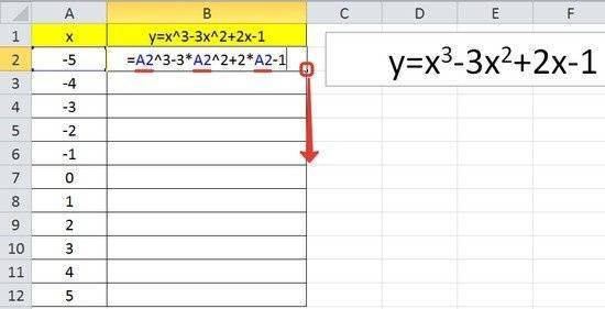 вам необходимо вычислить значения функции в этих точках. Для этого в ячейке B2 мы создадим формулу, соответствующую заданной функции, только вместо x мы введем значение переменной x, находящейся в ячейке слева (-5).