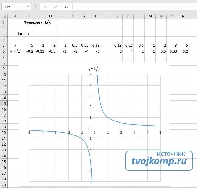 Чтобы построить гиперболу, заполните таблицу вручную (см. Рисунок ниже). Там, где ранее было нулевое значение аргумента, мы оставляем ячейку пустой.