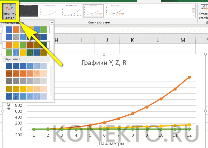 - А вызвав меню «Изменить цвета», расположенное в том же месте, вы можете выбрать палитру для каждой строки в отдельности или для всей диаграммы в целом.