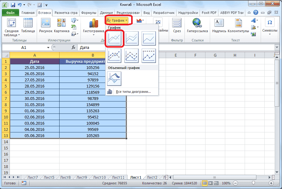 - Находясь во вкладке «Вставка», выделите область таблицы, в которой находятся расчетные данные, которые мы хотим видеть на графике. Затем на ленте на панели инструментов «Графики» нажмите кнопку «График».