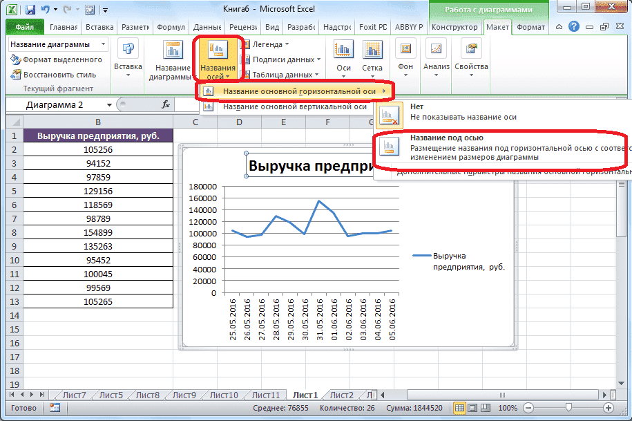 - вы можете присвоить имя осям, нажав кнопку «Имя оси». В раскрывающемся списке выберите запись «Имя основной горизонтальной оси», затем перейдите к позиции «Заголовок под осью».
