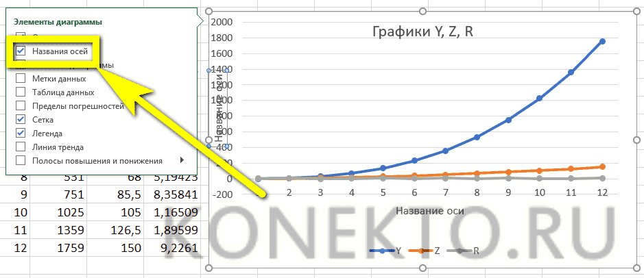 Как подписать оси в графике Excel