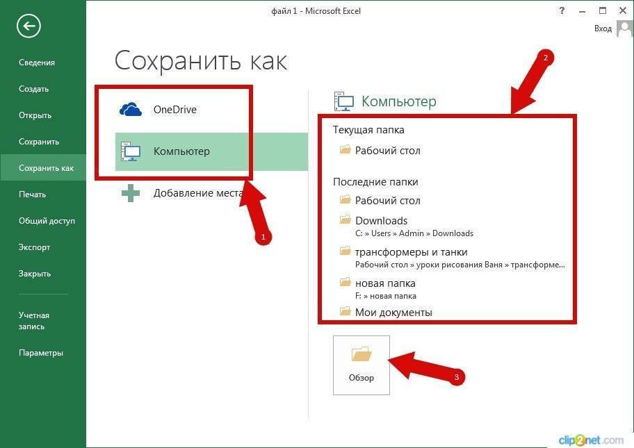 Выберите место для сохранения книги. Номер 2 показывает папки, в которых было сделано последнее сохранение. Если папки, которую необходимо сохранить, нет в списке, нажмите кнопку «Обзор».