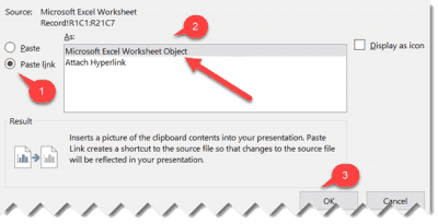 Во время просмотра выберите «Вставить ссылку» под заголовком «Специальная вставка», затем в разделе «Как выбрать объект листа Microsoft Excel.