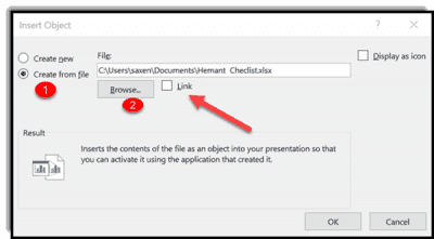 Затем щелкните или нажмите кнопку «Обзор» и в поле «Обзор» найдите книгу Excel с данными, которые вы хотите вставить, и ссылкой на нее. Установите флажок «Ссылка» рядом с кнопкой «Обзор».