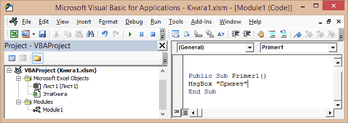 Функция MsgBox отображает информационное сообщение с указанным текстом. В нашем примере это «Привет».