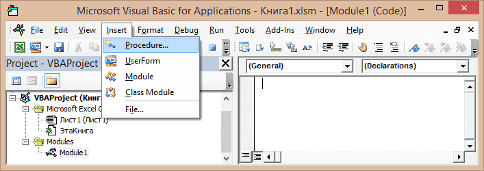 Добавим в стандартный модуль шаблон процедуры — его начальную и конечную строки, между которыми мы напишем нашу первую программу (процедуру, подпрограмму).