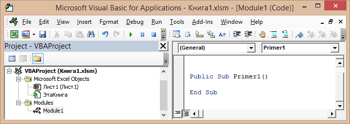 - Введите имя процедуры в поле «Имя»: «Primer1» или скопируйте его отсюда и вставьте в поле «Имя». Нажмите кнопку ОК, чтобы добавить в форму первую и последнюю строки процедуры.