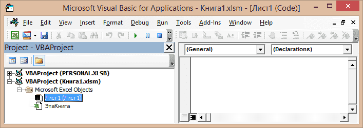В левой части редактора VBA находится Project Explorer, в котором отображаются все открытые книги Excel. Верхняя строчка, как на картинке, скорее всего у вас не будет, так как это личная книга макросов. Справа — модуль, в котором написаны процедуры (подпрограммы) с кодом VBA. На изображении открыт модуль листа, но дальше мы создадим стандартный программный модуль.