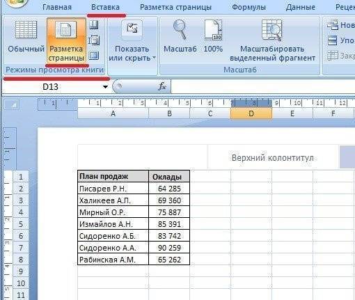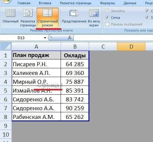 Первый способ. В панели настроек вверху нужно перейти во вкладку «Просмотр», в дальнем левом углу вы увидите блок настроек «Режим просмотра книги», там же вы найдете иконку «Макет страницы», вам нужно щелкнуть по нему. Вы сразу увидите, что программа Excel разбила весь лист на страницы, наша таблица стоит на первой.