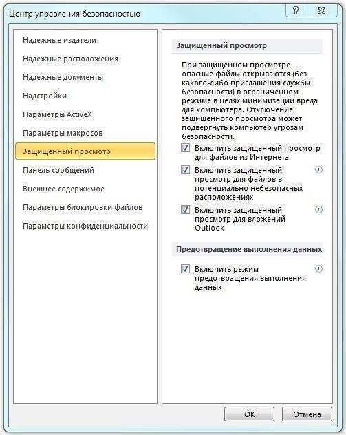 Защищенный просмотр включен при попытке открыть файлы: