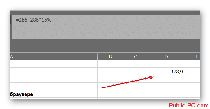 - Предположим, мы хотим получить число, которое получится, если мы добавим 15% к числу 286. Пример введенной формулы «= 286 + 286 * 15%».