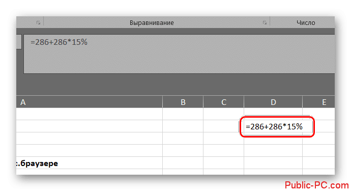 - Введите туда формулу в соответствии с моделью: «= (число) + (число) * (процентное значение)%». Обязательно не забудьте поставить знак процента в конце, иначе программа выполнит некорректные вычисления.
