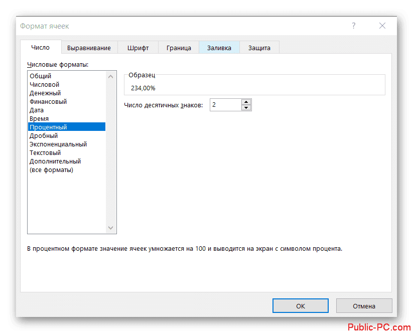 - Теперь обратите внимание на поле в левой части открывшегося окна. Он будет обозначен как «Числовые форматы». Из предложенных вариантов вам нужно выбрать «Процент».